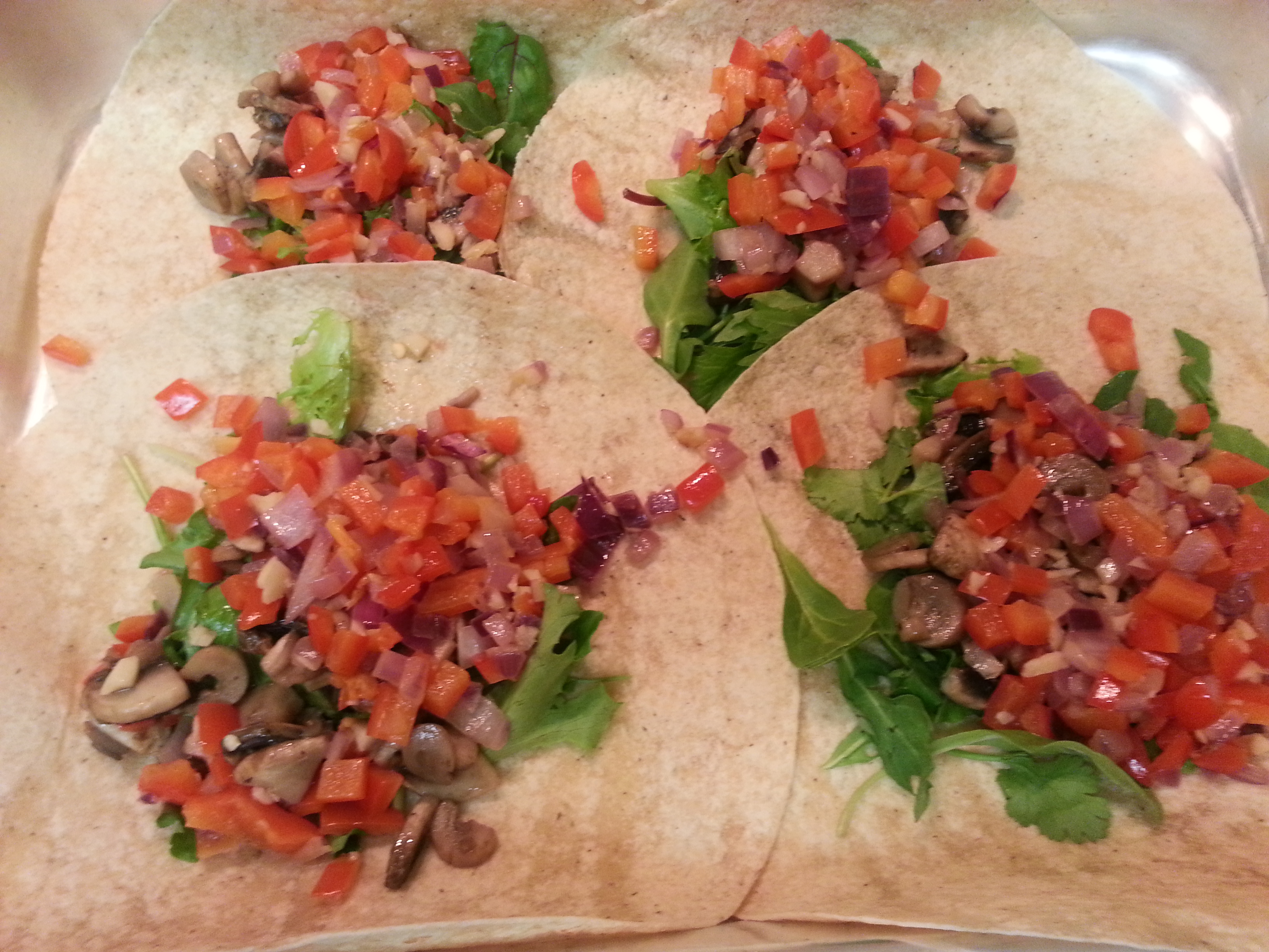 6) When the mushrooms look semi-done (they’re not white anymore), toss in the bell pepper and tomatoes and reduce the heat to medium. While this cooks, open up your salad mix and place a handful on each wrap. Put the salad mix back in the fridge. (1.5 mins.)