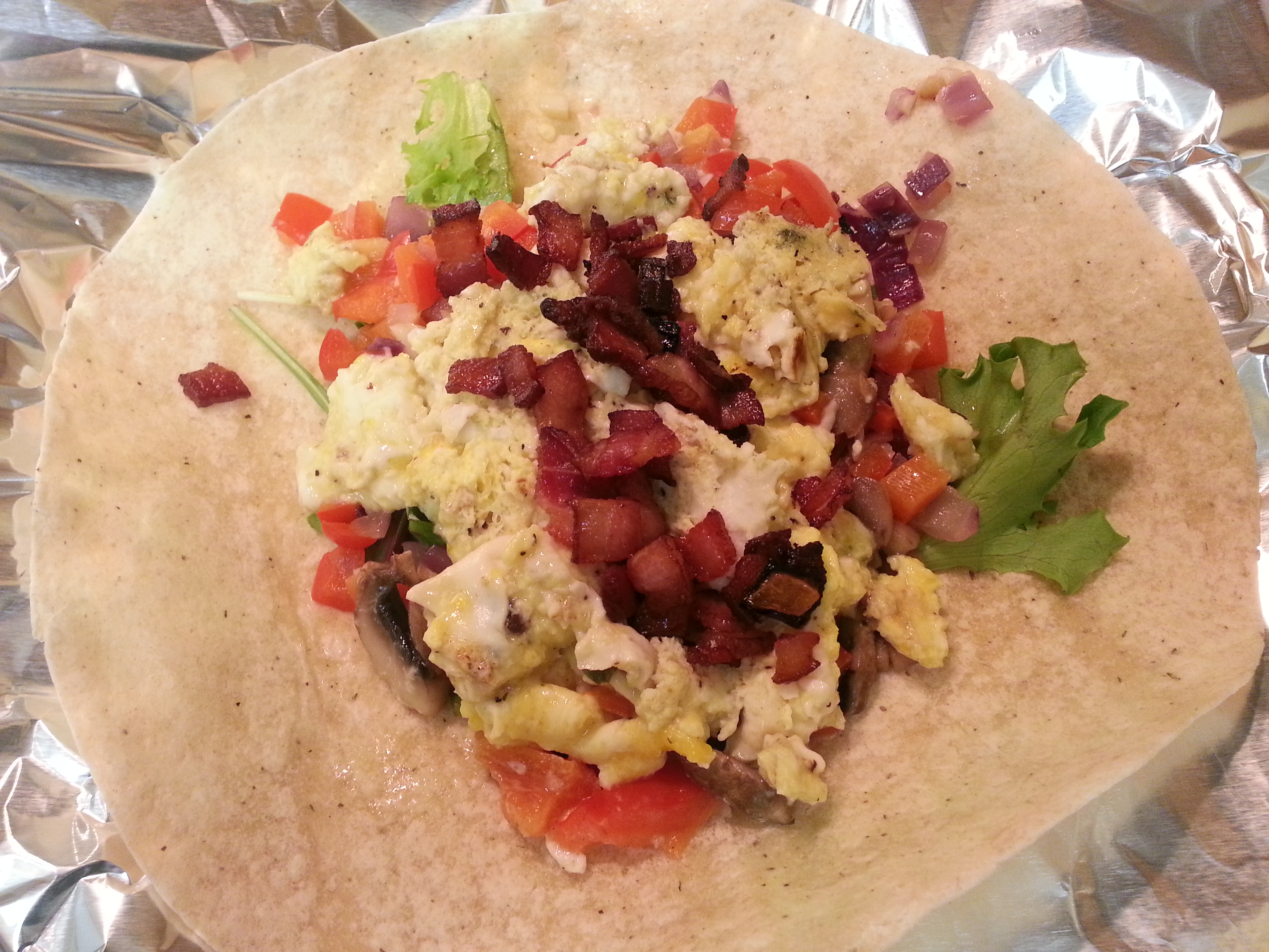 10) Scoop the eggs onto each wrap and top with the bacon from earlier. Use the remaining time to roll up the wraps and put in separate container or in foil for later consumption.