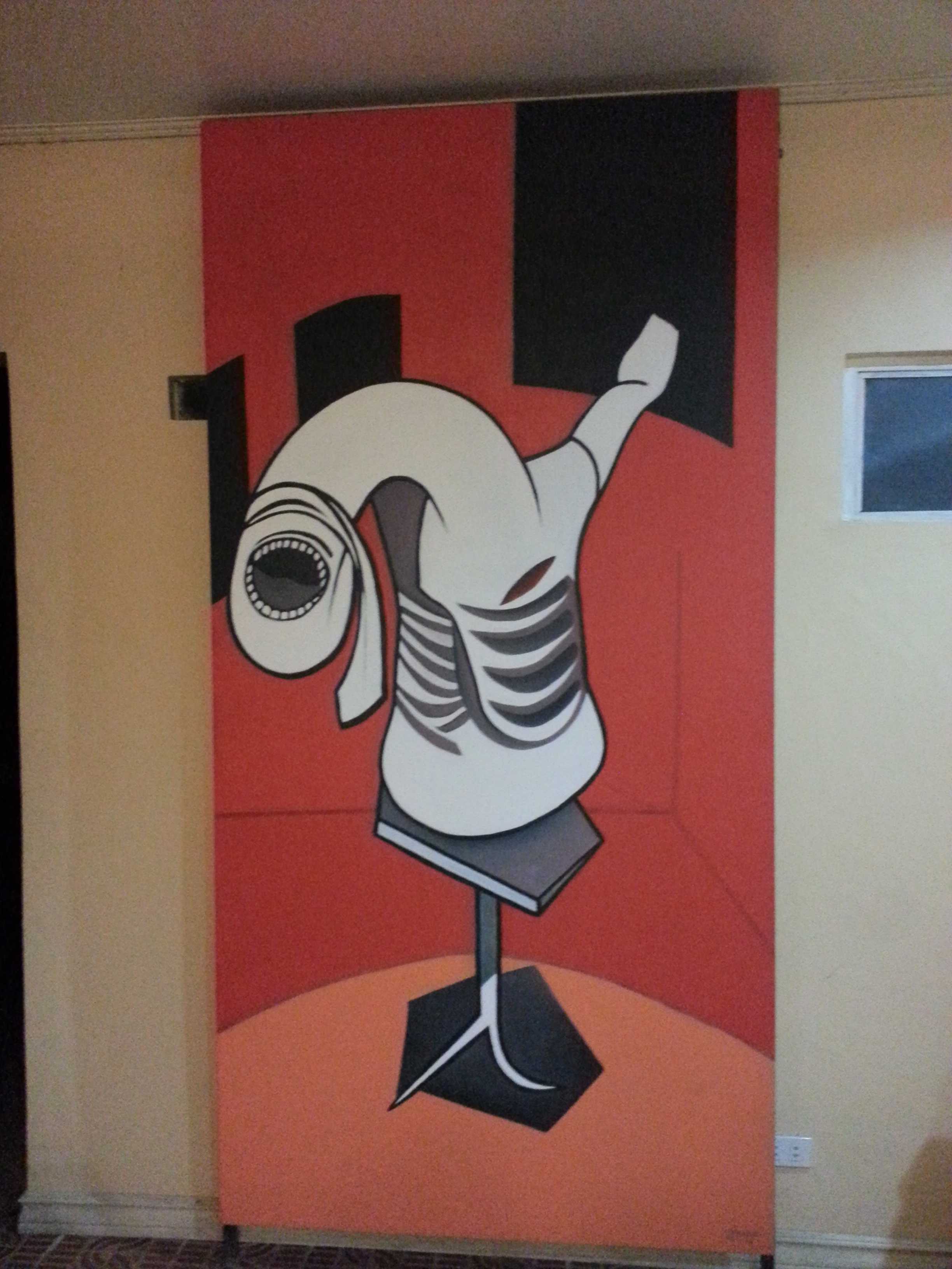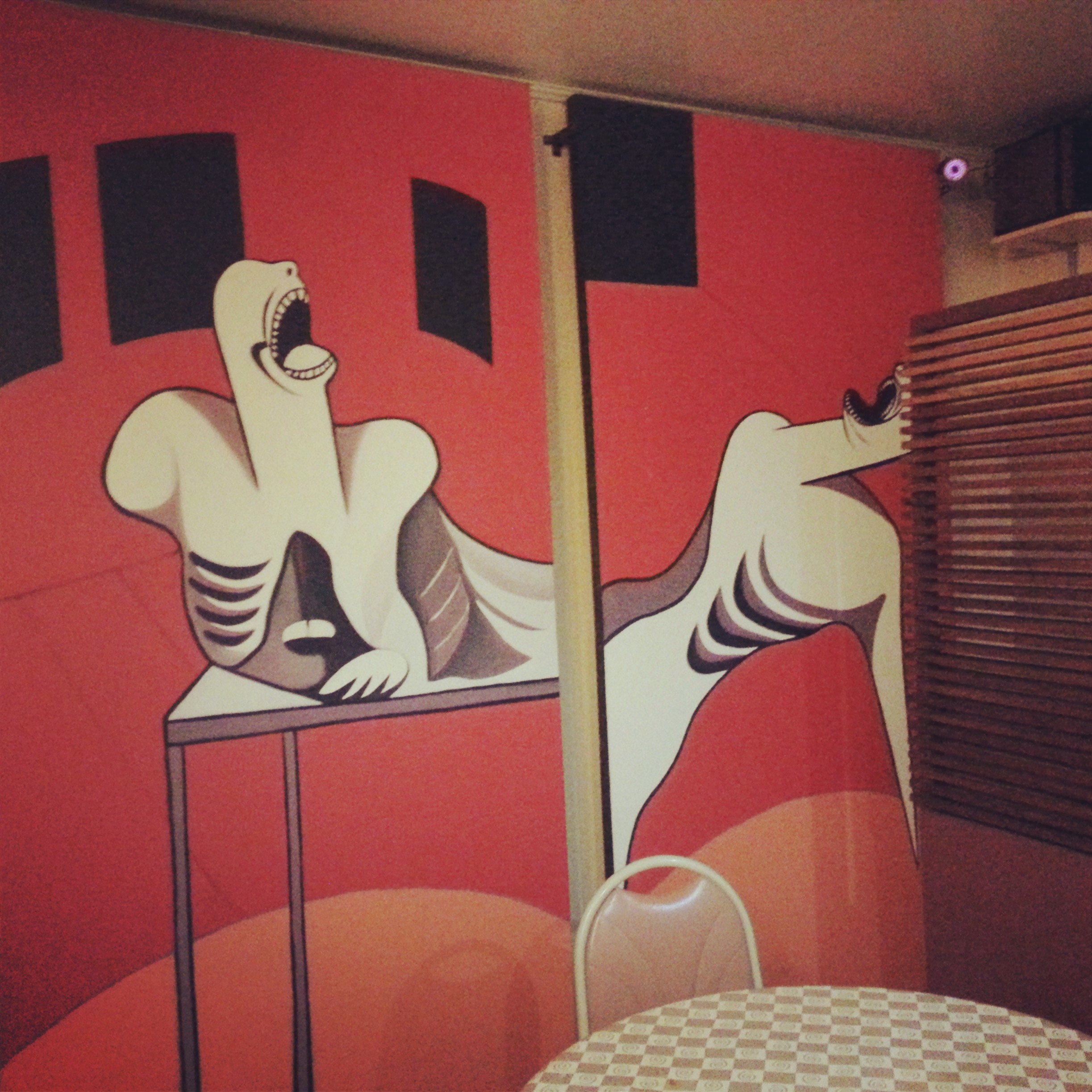 My heart sank when we entered the door. The small eatery that would have barely held 30 people was completely deserted save for the staff (who I later found out were a ragtag gang of Church volunteers, choir singers, and acolytes…a great way to keep the youth out of trouble!). At prime dinner hours, it was a bad sign. The Lovecraft-ian artwork on the wall was bizarre to say the least. Resignation sat in my stomach as I sat in the booth. We had been invited by the local parish priest who owned the establishment and I wasn’t about to turn down such an invitation lest I offend the powers above. A priest who runs a pizza shop? Then again…stranger things have happened on this trip.