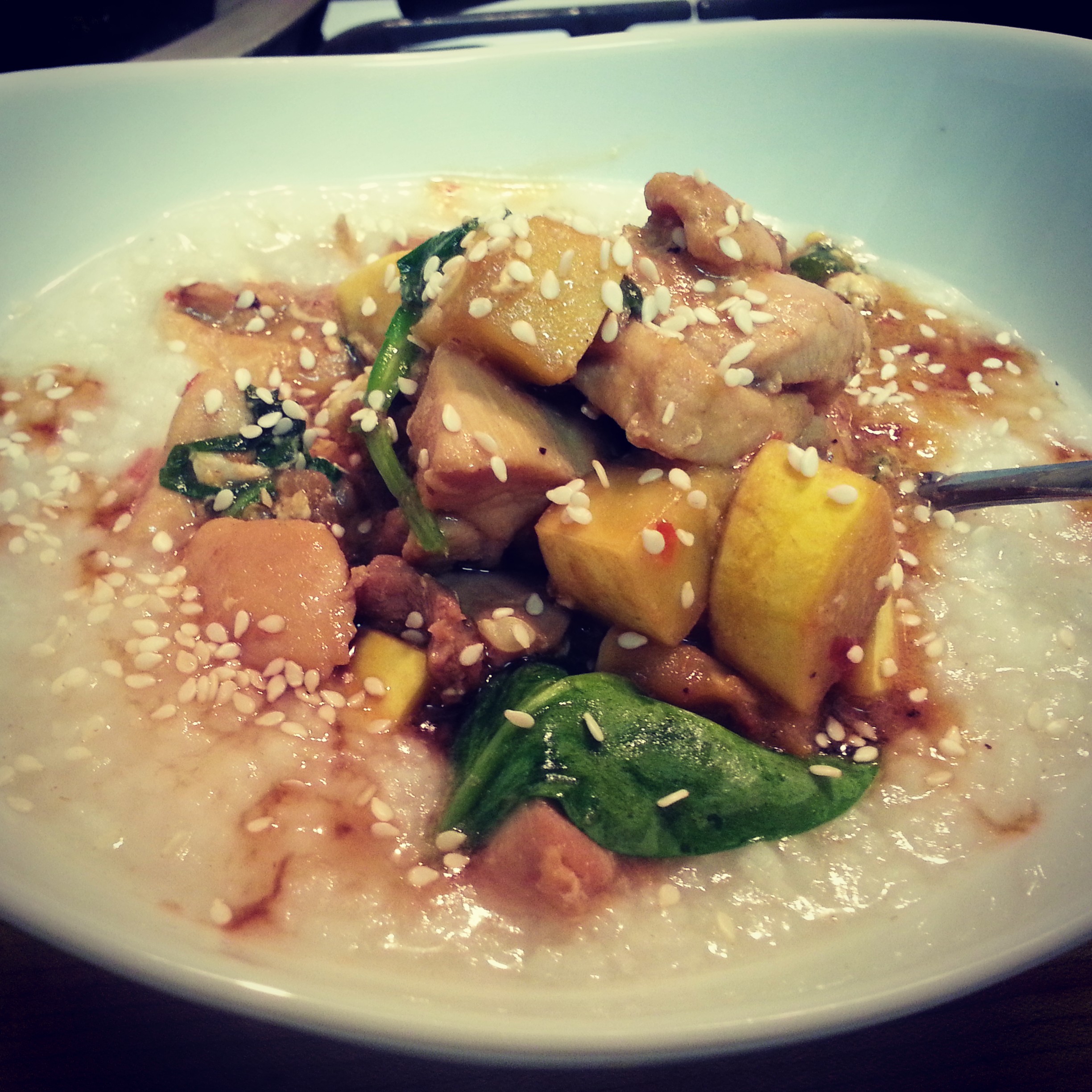 7) To plate, ladle some lugaw into your bowl, top with a bit of greens and squash, then the chicken. Drizzle a little soy sauce and sprinkle some sesame seeds and/or peanuts on top and you’re on your way to mid-Busy Season recovery!