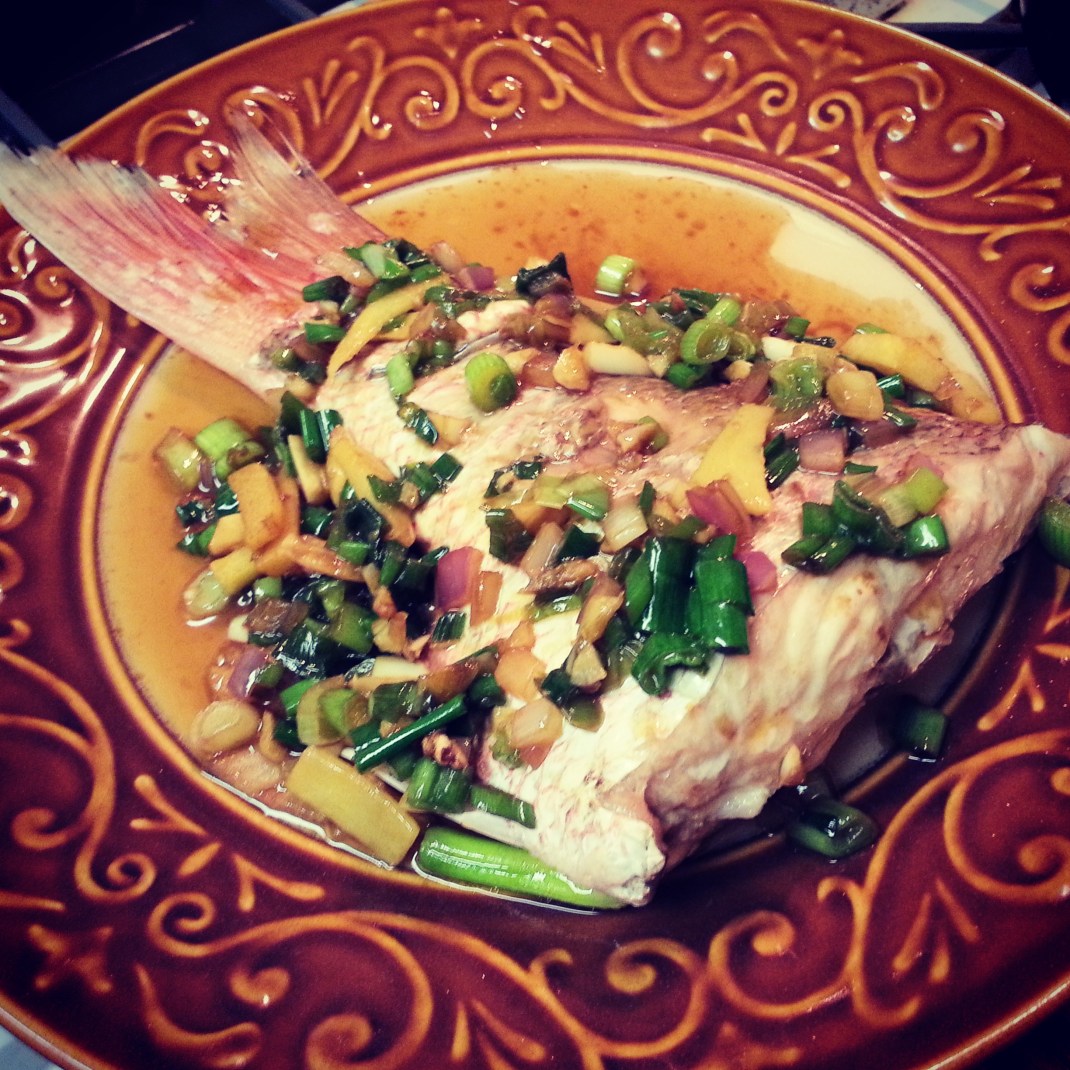 Tonight’s Busy Season Dinner is a Tea-Steamed Red Snapper Tail drizzled with hot sesame oil infused with ginger and spring onions. Typically a Cantonese or Teochew dish, steamed red snapper is not only cheap ($8.99/lb.), I managed to cook the whole thing (while cooking the next day’s breakfast at the same time mind you) within half an hour. Plus, with a minimal number of ingredients and the healthiness of fish compared to that gut-bustin’ burger you must be chompin’ on, you’d be a fool not to make this dish (or you’re on a particularly difficult audit that doesn’t let you leave until 2 AM in which case, you’re excused).