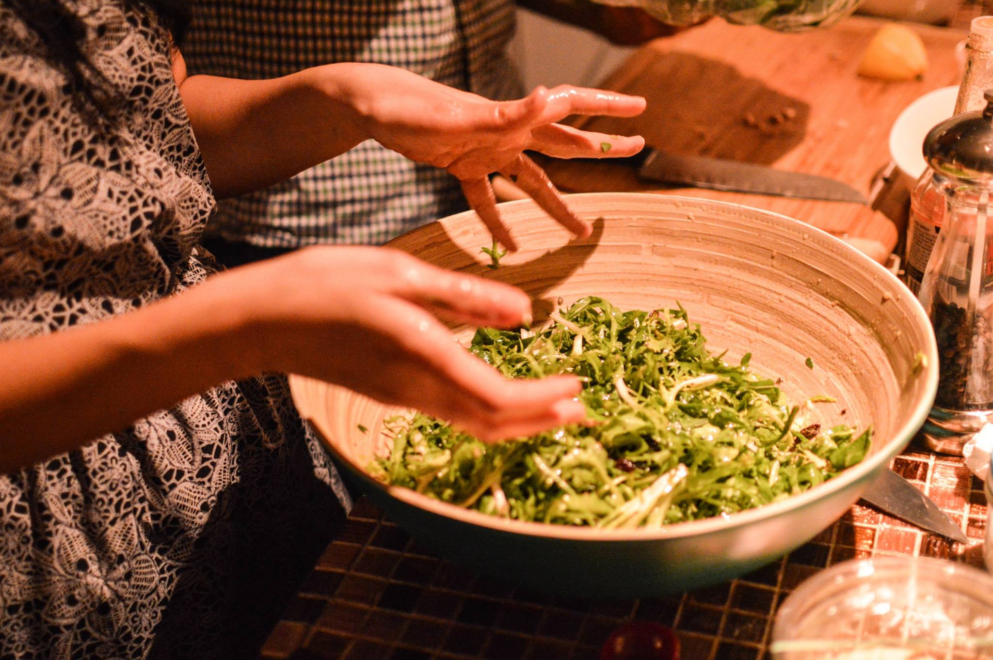 5) To plate, toss in your greens, squeeze some lemon on tops and mix not with some fancy wooden contraption, but with your own two hands. Sprinkle the shallots and grapes on top and garnish with lemons.