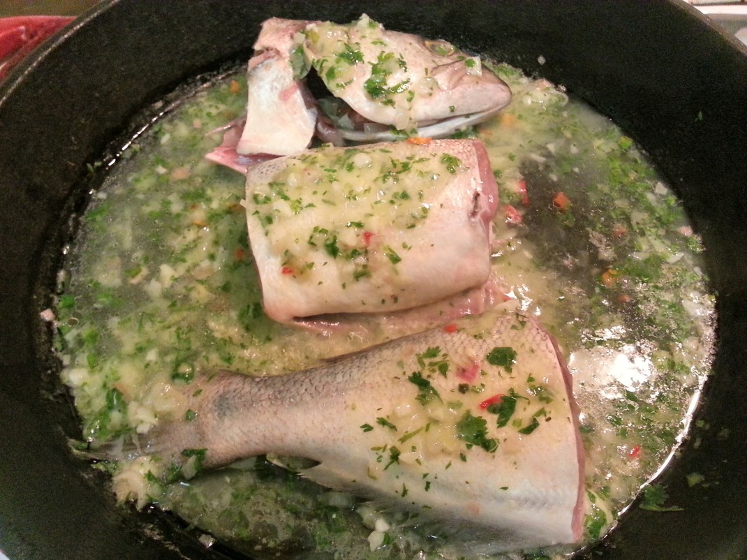 6) Check the fish for done-ness by poking it lightly with a fork. Look for flakiness and white flesh all the way through. Once it’s done, sprinkle the remaining parsley on top. Plate the fish, drizzling a bit of the now spicy and thickened sauce on top and squeezing a bit more lemon if you’d like. Serve with some wilted greens or – Chef Adria forgive me – white rice.