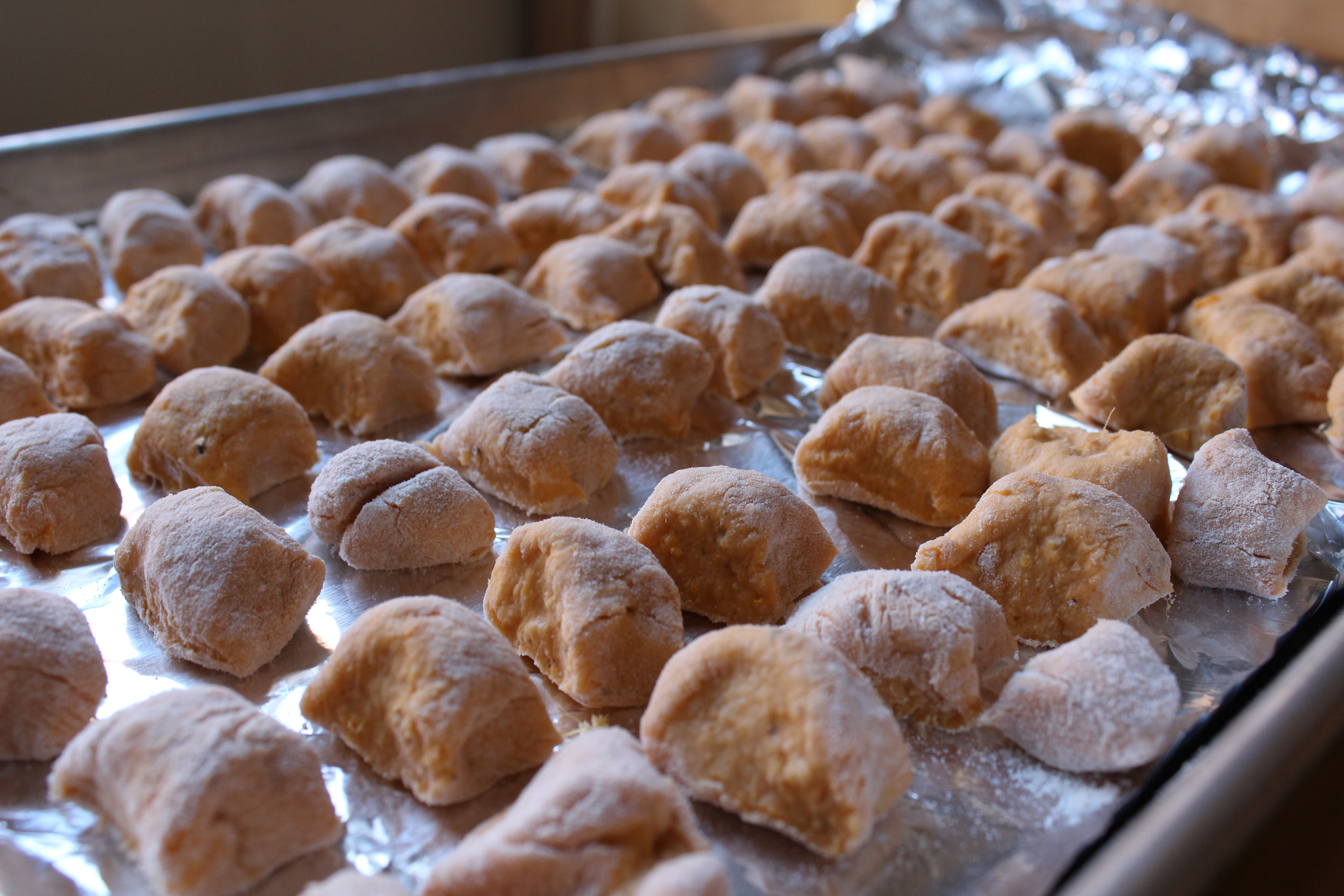 1) Prepare the gnocchi. Boil the sweet potatoes, skin-on, until tender (~30 mins.), dump hot water and rinse with cold until safe to handle.