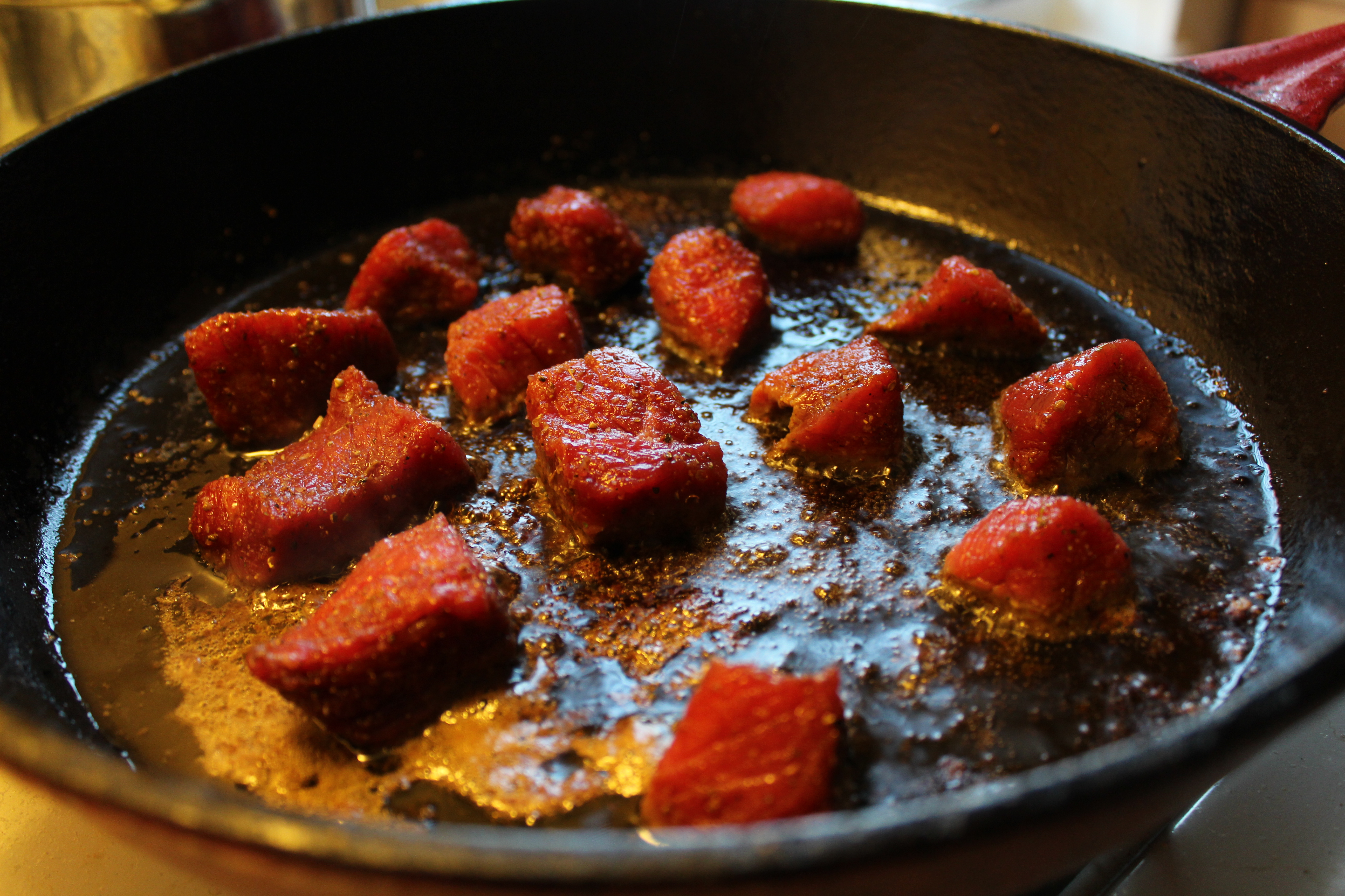 6) Cooking in batches, sear the meat until brown on all sides and set aside on a plate.