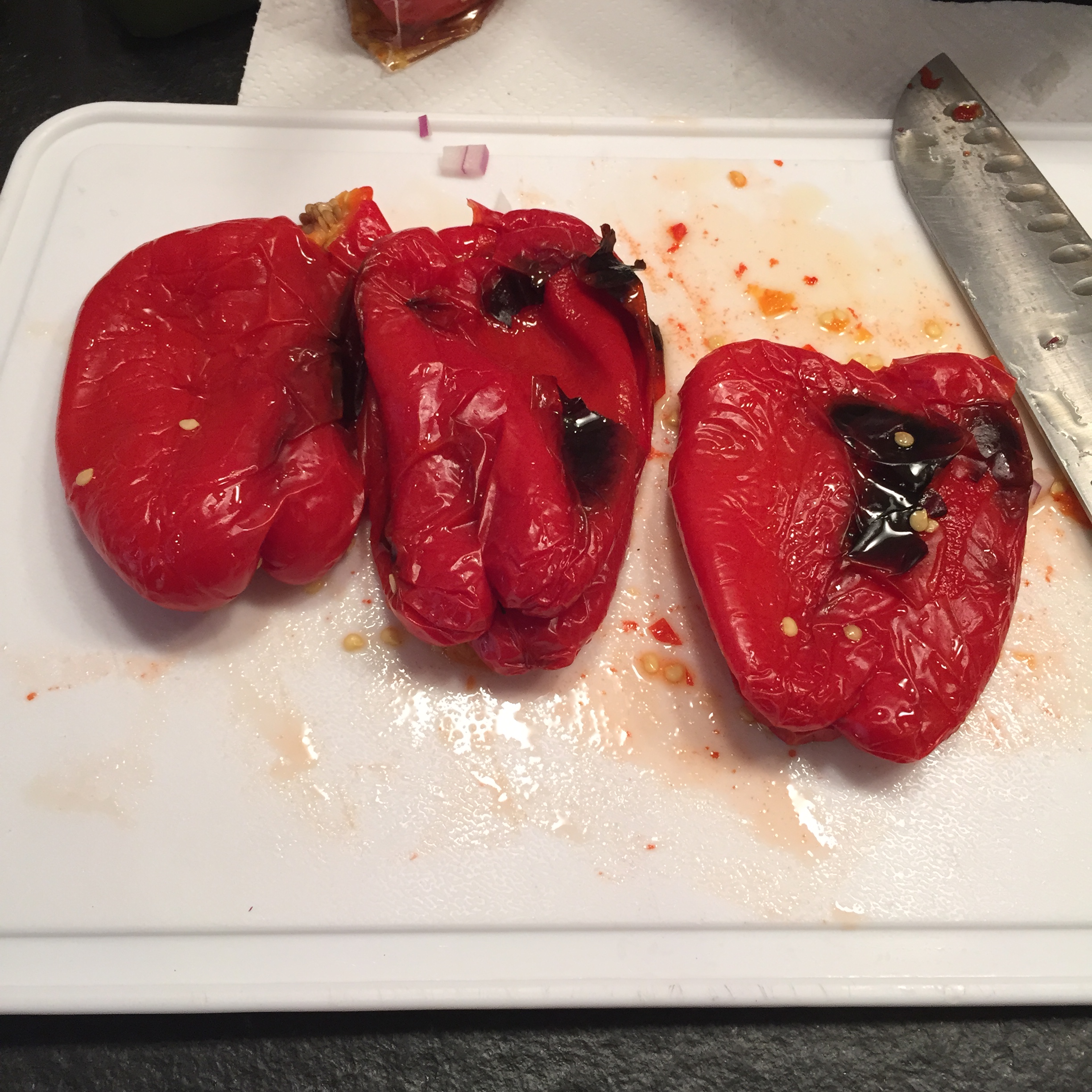 2) Place the peppers on a baking sheet lined with foil and place them under the broiler on the top rack about 4 – 6″ away from the flame. If you’ve got your heat on high, watch them closely since they char pretty quickly. When they do, turn them over until all sides are black (don’t worry about “over-charring”. You’re peelin’ ’em anyway) and the insides nice and soft. Set aside to cool for 15 minutes.