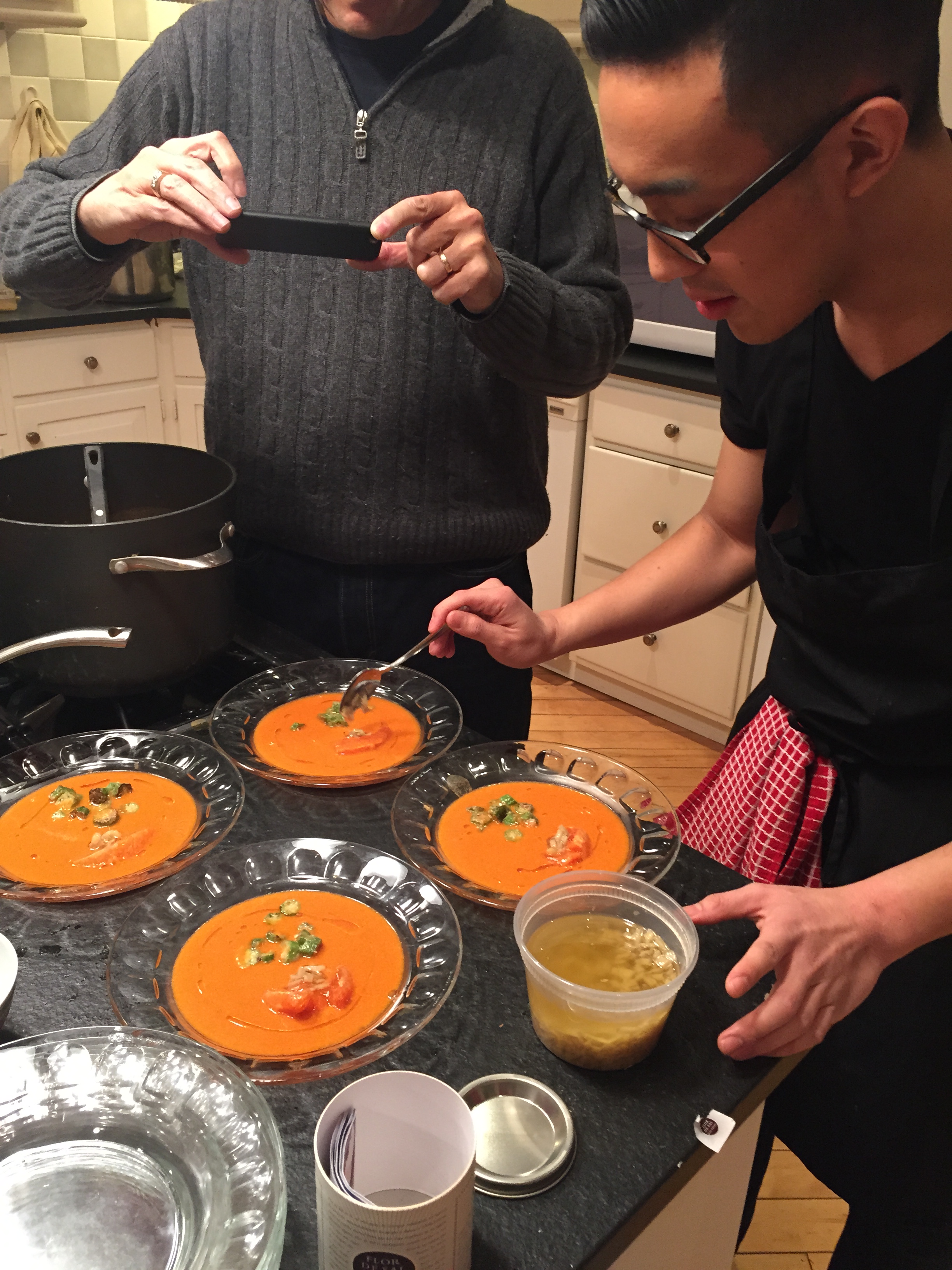7) Return the now smooth bisque into the stock pot and bring to a simmer along with the citrus juices. Add a cup of cream (more later if you’d like). You can also add more stock if it’s too thick. Season with salt. We’ll now shift to the garnishes.