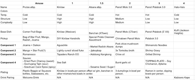If you only happen to be playing with a single dish, tweaking variables can be quite simple (what would a Green Risotto look like instead of the usual yellow Milanese? How would one make “hot” Ice Cream? Can a stew be crunchy? … you can see all the fun possibilities right?). When creating a multi-dish/course menu however, you also want to make sure that the variables you’ve chosen to tweak play well with each other. Have you inadvertently made the whole menu a boring brown even if they all taste different? Are you OK with that? Have you made everything technicolor at the expense of good taste? Perhaps there’s too much meat and complex plating on the menu. I can’t count the number of times we’ve failed and succeeded based on how much time we spent making sure we have components that make sense together.