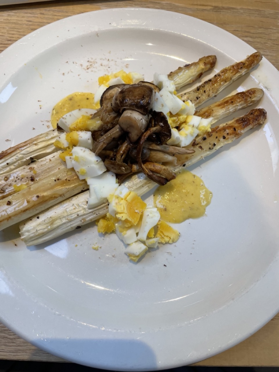 The meals too were a stubborn yet simple affair when takeout and microwaved leftovers would have done: creamy spaghetti sprinkled with nori, sometimes topped with crispy eggs and whatever greens were wilting from inattention in the fridge, or even white asparagus with hard-boiled eggs and those featureless button mushrooms from the supermarket. They were stubborn against both the American work ethic and the perceived ordinariness of my days.